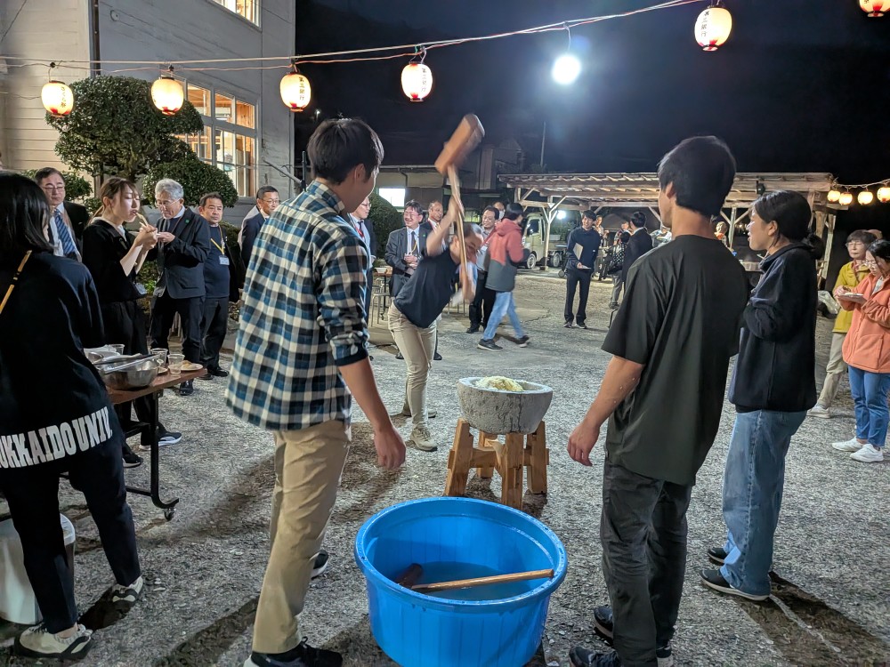式典の締めくくりは、地元で伝統的に行われているお祝い事には欠かせない「餅まき」でした。その豪快さには驚かされました。地元住民のご協力で、前日に餅つきをして1200個も丸餅を作ったと言っておられました。